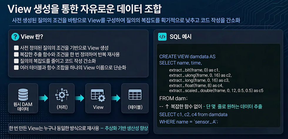DAQ 장비에서 수집되는 비트 크기 수준의 센서 데이터를 SQL로 직관적으로 조작할 수 있습니다. 복잡한 바이너리 변환 코드를 따로 작성하지 않아도 됩니다.