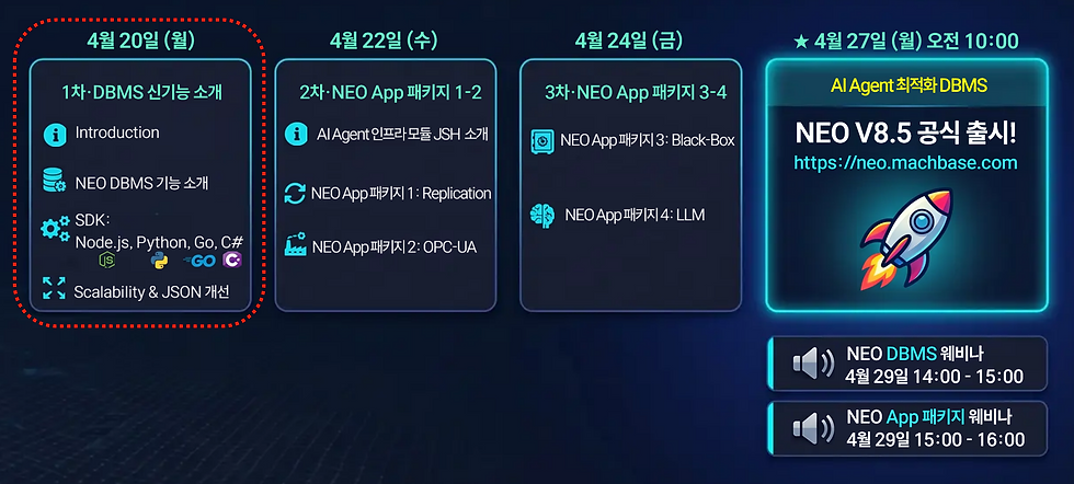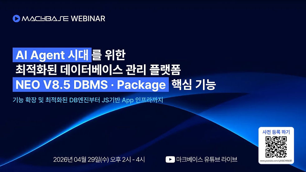 2026년 4월 27일 오전 10시, AI 에이전트가 가장 잘 이해하고 스스로 일할 수 있게 설계된 차세대 인프라, AI 데이터 관리의 패러다임을 바꿀 Machbase NEO V8.5가 공식 출시됩니다.