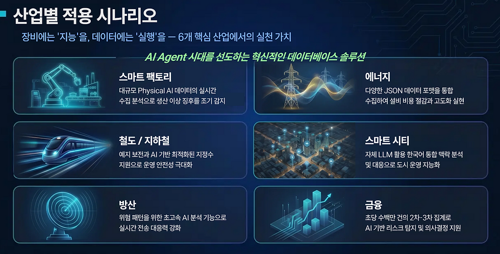 로봇과 Physical AI가 쏟아내는 고빈도 센서 스트림, 금융 시장의 밀리초 단위 시세 데이터, 공장 라인의 실시간 품질 지표, 대규모 배터리 팩의 전압·온도 시계열, 이 모두를 단일 플랫폼에서 처리하고 AI 파이프라인으로 이어줍니다.