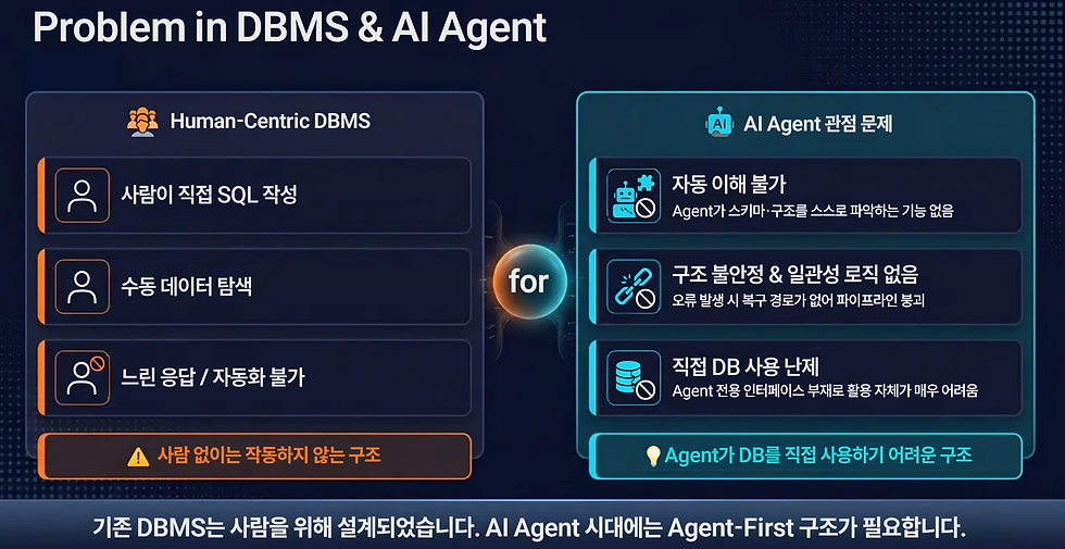 지금까지의 데이터베이스(DBMS)는 사람이 직접 SQL을 짜고, 수동으로 데이터를 탐색해야만 움직이는 '사람 중심'의 구조였기 때문입니다.