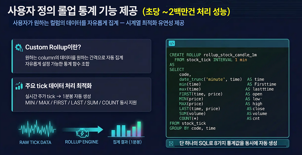 금융 산업을 위한 다양한 컬럼의 초고속 통계 재생성 기능을 제공합니다. 사용자가 정의한 기준으로 ROLLUP을 생성할 수 있어, 시계열 집계의 유연성이 획기적으로 높아집니다.