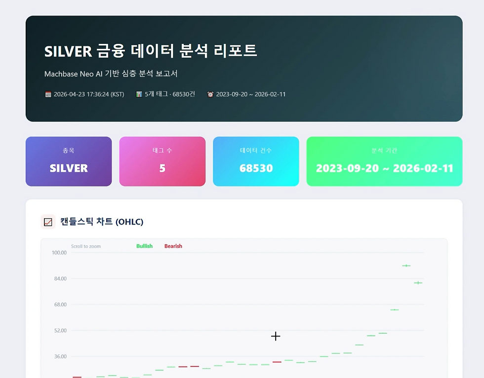 "지난주 장비 이상 발생 구간에 대해 리포트 써줘"라고 말해보세요. 내장된 AI 에이전트가 DB 내의 매뉴얼과 시계열 데이터를 분석해 즉각적인 HTML 리포트를 생성합니다.
